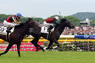 【優駿牝馬(GI)】(東京)~アパパネ&サンテミリオン 史上初の同着優勝 東京11Rの第71回優駿牝馬(GI、3歳牝馬、芝2400m)は、1番人気アパパネ(蛯名正義騎手)と5番人気サンテミリオン(横山典弘騎手)の同着優勝となった。中団からレースを進めた両頭。直線残り200mで外から並ぶように抜け出すと後はゴールまでマッチレースを展開。長い写真判定の結果、JRA史上初のGI同着優勝で決着。勝ちタイムは2分29秒9(稍重)。2頭からさらに2馬身差で3着に8番人気アグネスワルツが入った。 ~レース後のコメント~ 1着同着 アパパネ(蛯名騎手) 「負けなくて良かったです。どちらも勝者で良かったです。不安と言われた距離もこなしてくれましたし、こういう馬場もこなしてくれて良かったです」 1着同着 サンテミリオン(横山典騎手) 「蛯名騎手から“おめでとう”と言われましたし、有利だと思っていました。写真判定が長くてどうかと思いましたけど、大外枠からよく頑張ってくれました」 3着 アグネスワルツ(柴田善騎手) 「前回と同じで、交わされてからもしぶといところを見せているのですが…」 4着 アニメイトバイオ(後藤騎手) 「いい競馬でした。大健闘と言うよりも、これくらい走れて当然の馬だと思いますから、もう少し何とかならなかったかと反省の気持ちの方が残ります。アパパネ、オウケンサクラを見ながら手応えよく行けました。距離も大丈夫でしたし、道悪も思った以上にこなしてくれました」 5着 オウケンサクラ(安藤勝騎手) 「前へ行くと馬場の悪い内側を通ることになりますから、今日は行くつもりはありませんでした。ジワジワ伸びていましたから、サンテミリオン、アパパネより先に動けるところにつけていれば良かったと思います。馬場も気にしていませんでした」 6着 アプリコットフィズ(四位騎手) 「枠順が出た時には、アパパネもサンテミリオンも外枠だったので、内枠が当たってしめしめと思っていましたが、今日のこの天気、馬場では結果的にアダになったと思います。道中、道悪でバランスを崩していましたから…。いい感じで抜けられましたけど、残り300mで脚が鈍ってしまいました」 scrolling="no" marginwidth="0" marginheight="0" border="0" frameborder="0" style="border:none;">