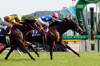 【安田記念(GI)】(東京)~ショウワモダン 3連勝でGI戴冠 東京11Rの第60回安田記念(GI、3歳上、芝1600m)は8番人気ショウワモダン(後藤浩輝騎手)が中団追走から直線の追い比べを制して優勝。勝ちタイムは1分31秒7(良)。1/2馬身差2着に後方から追い上げた6番人気スーパーホーネット、さらにアタマ差で3着に内から脚を伸ばした5番人気スマイルジャックが入った。1番人気リーチザクラウンは好位追走も直線伸び切れず14着に惨敗。 ~レース後のコメント~ 1着 ショウワモダン(後藤騎手) 「初めて安田記念を勝った時を思い出しました。状態が良かったし、枠順も良かったです。天気が良すぎることだけが心配でした。前回もいい走りをしていたので狙っていました。馬も疲れが取れて調教も良かったので自信を持って乗りました。思い描いたレースで、直線も抜群の手応えでしたが、先週のダービーを思い出して、もう少し我慢、我慢とギリギリで追い出しました。まだまだこれからの馬ですからこれからも応援よろしくお願いします」 2着 スーパーホーネット(藤岡佑騎手) 「気合を前面に出していて、自信を持って乗りました。いい位置につけられましたし、外に出したら抜群の手応えでした。でも並んでからが遠かったですね」 3着 スマイルジャック(三浦騎手) 「この馬の競馬をさせることが出来ました。でもまだまだ注文はありますし、それが今回の着差だと思います。今日はペースも流れて折り合いもつきました。直線も内からスルスルと抜けて行って一瞬“オッ”と思ったのですが、その後脚色が一緒になってしまいました」 4着 トライアンフマーチ(内田博騎手) 「外枠でしたが、馬なりで脚をタメながら前々でレースを進めることが出来ました。ただ、直線を向いてからは何となく伸びるという感じでした」 6着 ファリダット(蛯名騎手) 「馬群の中に入りたかったけどゴチャついていましたから。それでも外へは出さず、相当我慢して追い出しました。手応えは良かったのですが、交わせそうで交わせませんでした」 9着 フェローシップ(パートン騎手) 「レースの前から馬がかなり神経質だったことに加え、スタートが良すぎて馬が興奮してしまった。最後の直線もこの馬なりに伸びてはいましたが、前半でエネルギーを使ってしまった」 11着 ビューティーフラッシュ(コーツィー騎手) 「香港でのレースとは違い、コーナーリングがうまくなかった。また、直線での伸びもいま一つだった」 13着 サンカルロ(吉田豊騎手) 「速い馬場がどうかと思いましたが、よく頑張っています。休み明け、一頓挫あり、前走よりはいいなと思ったけど、走っている頃と比べるとまだ戻っていません」 14着 リーチザクラウン(安藤勝騎手) 「スタートはマズマズ。3番手の内くらいで競馬をしたかったが、5番手の内になってしまいました。今まで馬込みで競馬をしていなくて、他馬に神経を使ってしまいました。流れにはついて行けたが、本質的には2000mくらいが合っているのだと思います」 scrolling="no" marginwidth="0" marginheight="0" border="0" frameborder="0" style="border:none;">